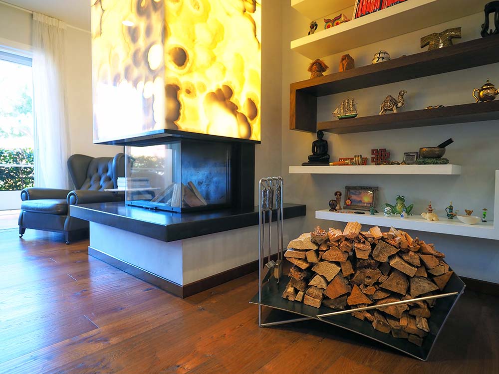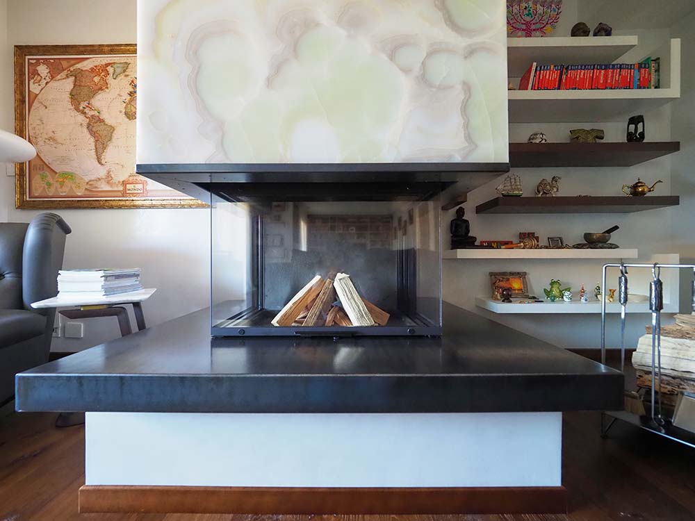 Camino in lamiera nera con pietra onice retro illuminata.