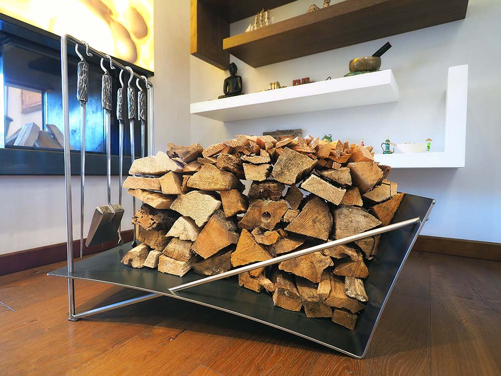 Mobile porta legna con attrezzi per camino in acciaio inox forgiato