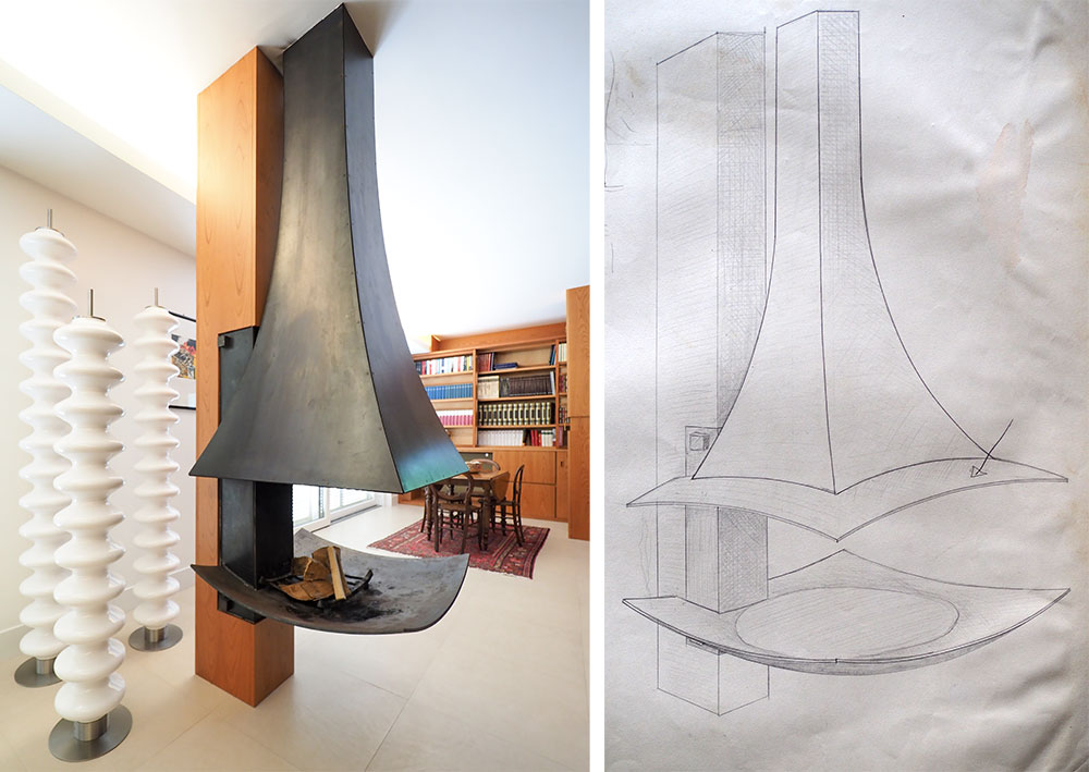 Braciere realizzato con una lastra di ferro 10 mm di spessore sagomata, sospesa ed ancorata ad una colonna di cemento armato preesistente , la cappa realizzata con un doppio strato di lamiera nera da 20/10 mm. Il rivestimento della colonna é legno di ciliegio.