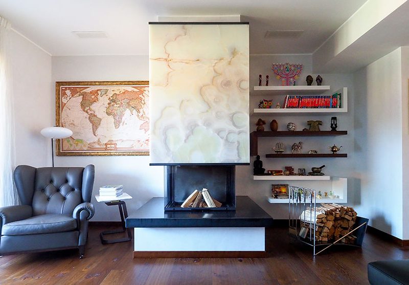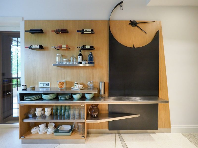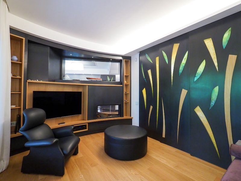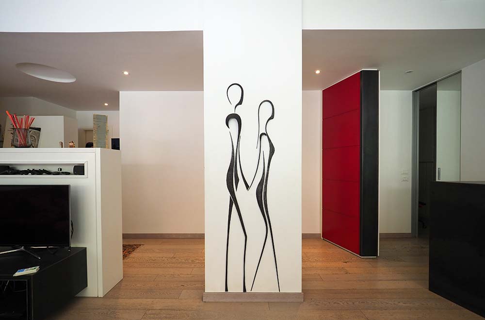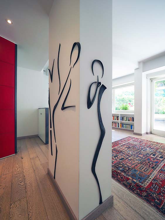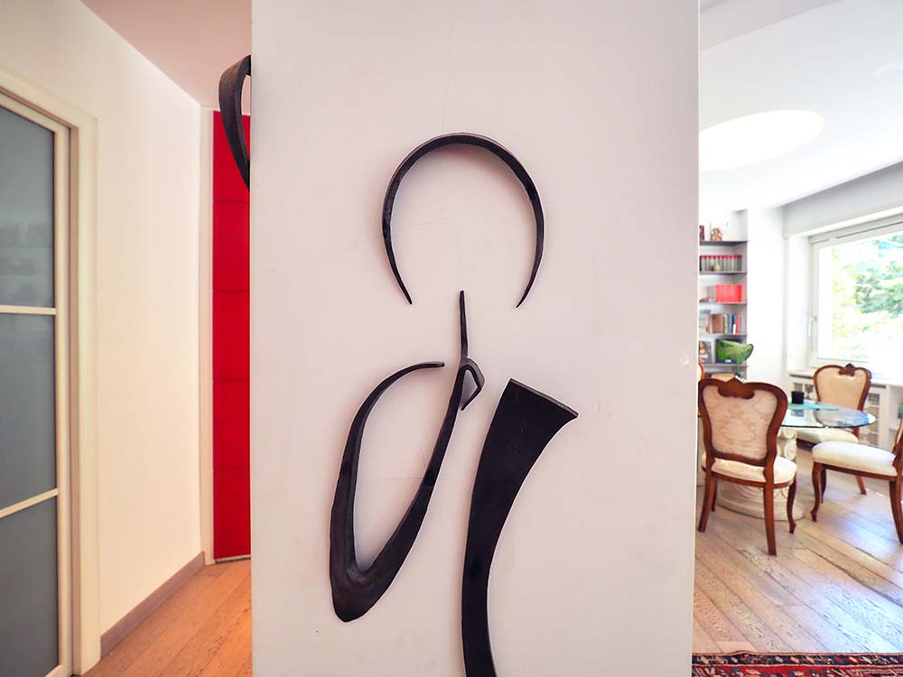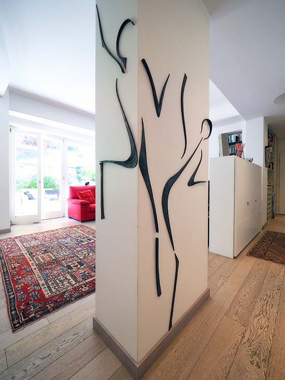 Intervento scultoreo realizzato con ferri forgiati in rilievo sulla colonna, i segni delineano e rappresentano i componenti della famiglia che abita la casa, le linee sono minimali.
