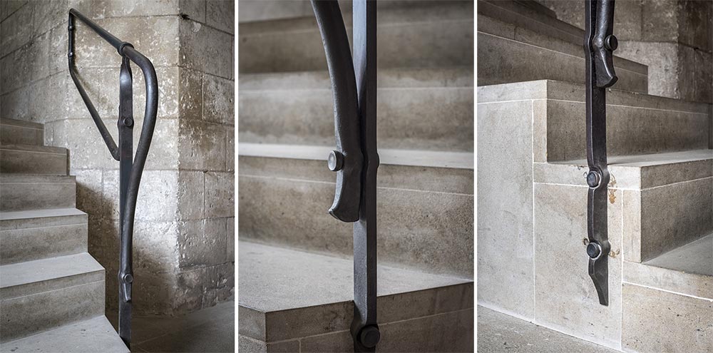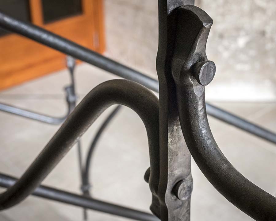 La ringhiera é stata progettata seguendo linee sobrie essenziali, é caratterizzata da piccole deformazioni plastiche del materiale funzionali all’assemblaggio degli elementi costitutivi (incastri e chiodature)