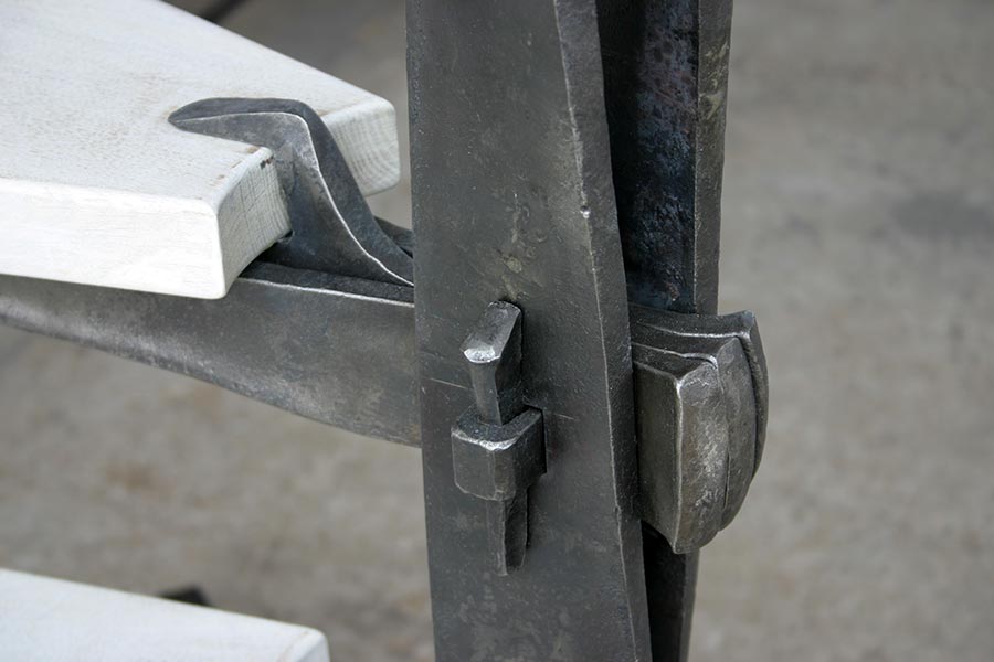 Prototipo di una scala a chiocciola completamente smontabile in ferro battuto e legno, realizzata utilizzando la tecnica di assemblaggio che utilizza cunei per il fissaggio.