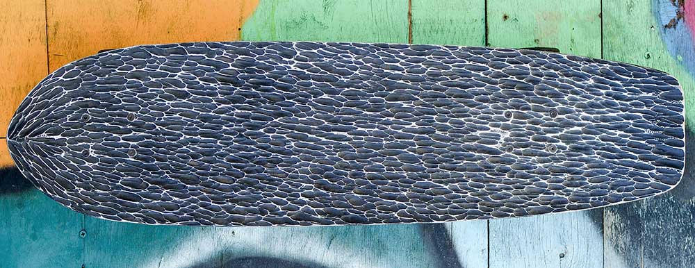 1. Surfskate in alluminio forgiato , la parte superiore con segni evidenti di martello (grip) la parte inferiore con grafiche colorate.