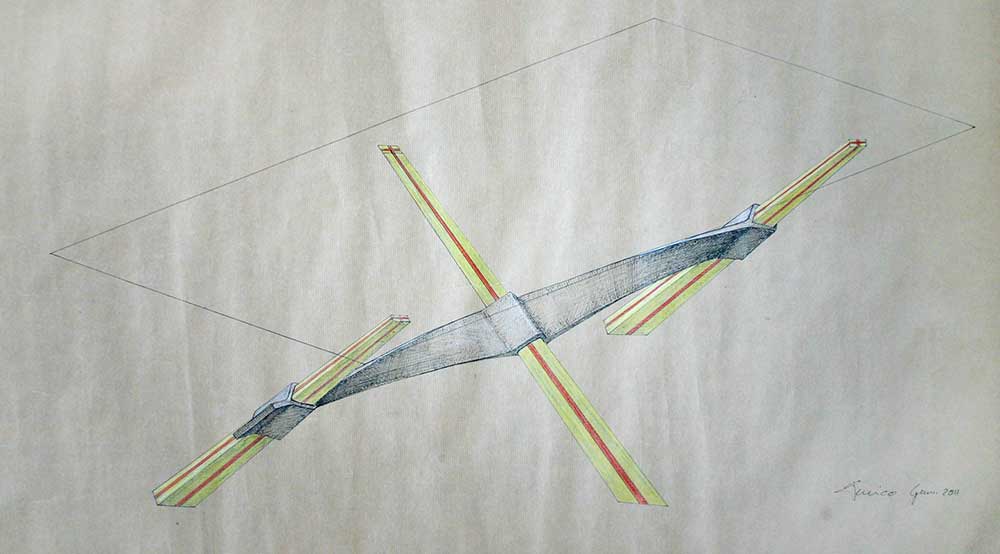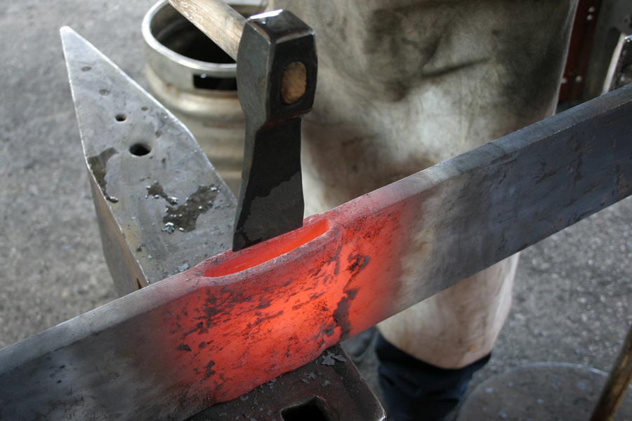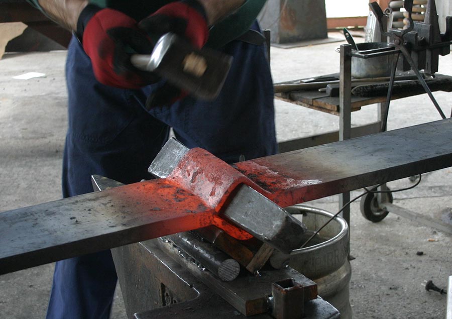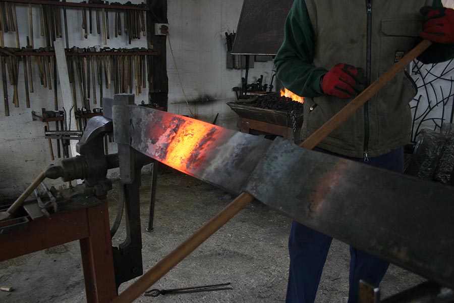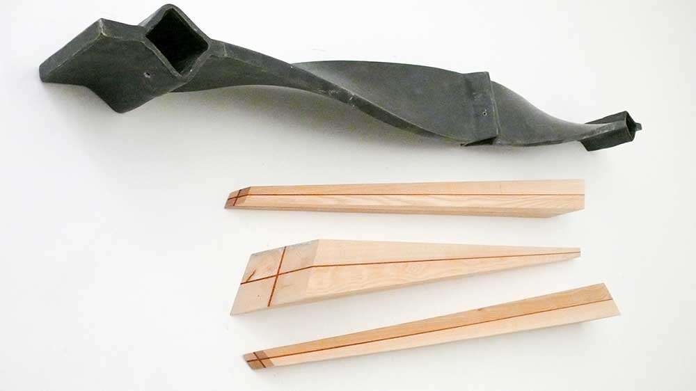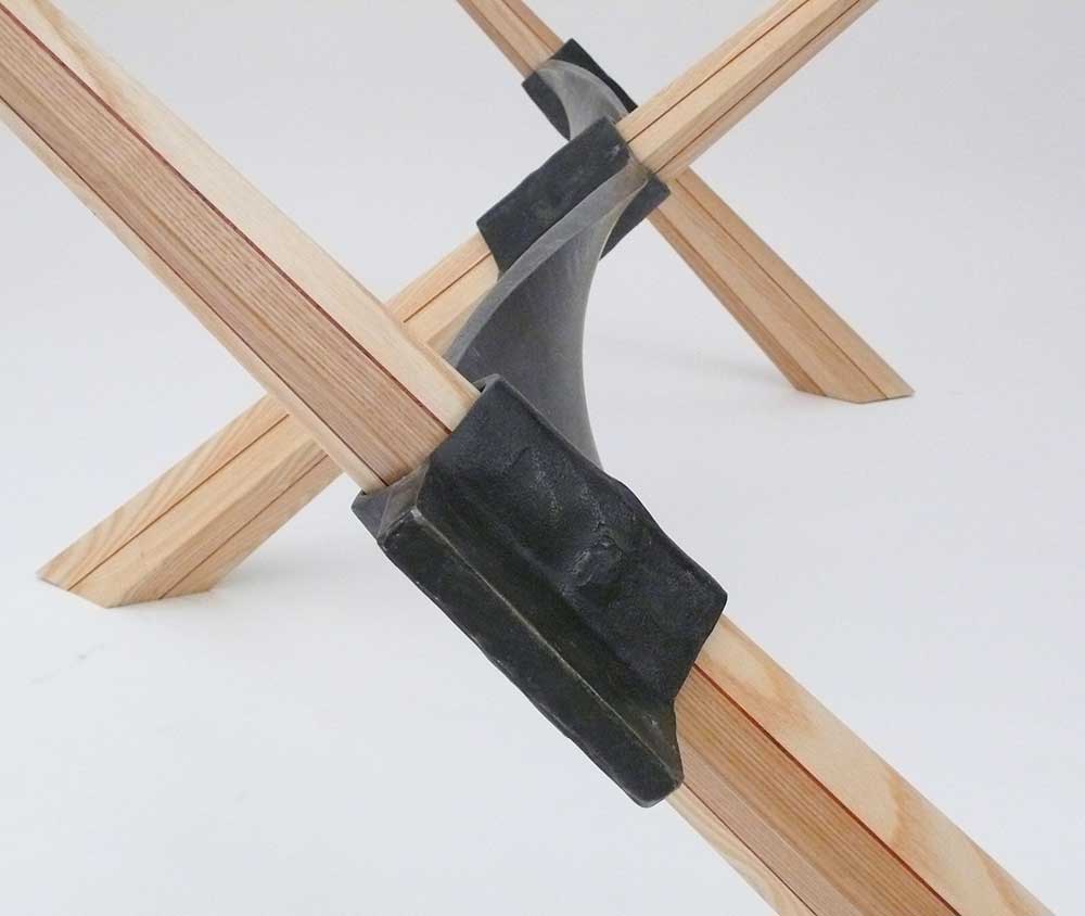 Il ferro centrale é una barra larga 12cm e spessa 2cm forata a caldo e torta, questa accoglie tre cunei di legno di frassino con dettagli in legno paduk che fungono da gambe.